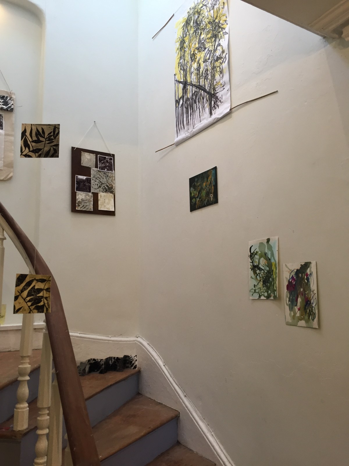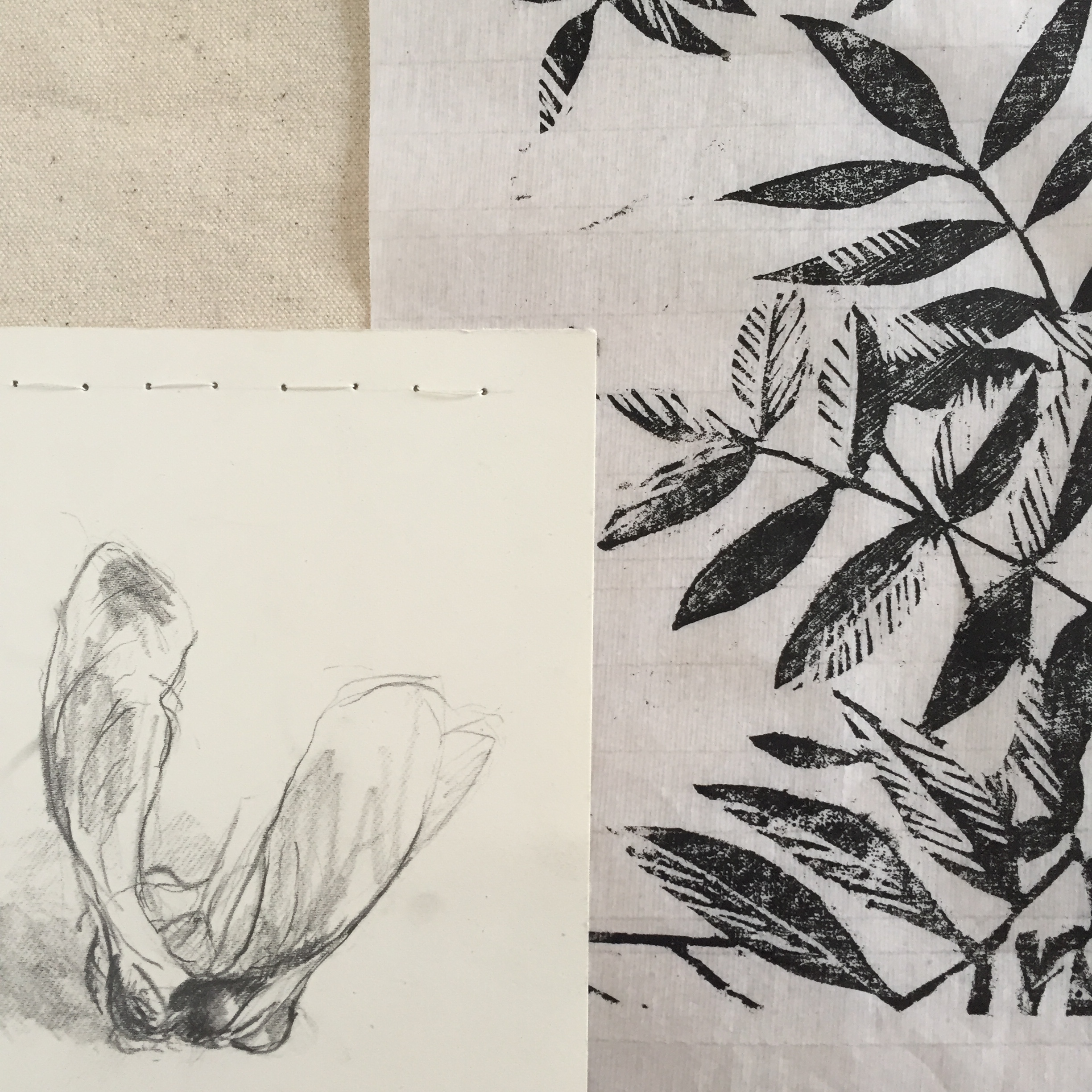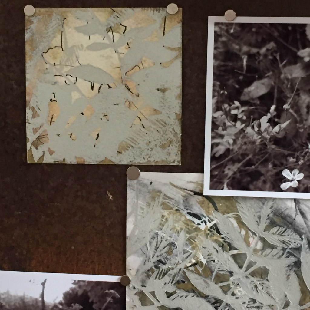 I over-printed many of my drawings with woodcut prints of ash-leaf designs, carved into off-cuts of MDF. The tree so influences the life of the garden. It is not inside the garden, but the plants and the birds and the insects don’t know boundaries.
