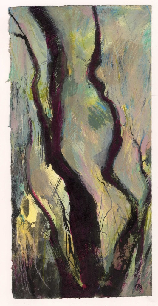 Gwaith mewn paent sy wedi’i ysbrydoli gan gerdded yng Nghwm Gwendraeth.